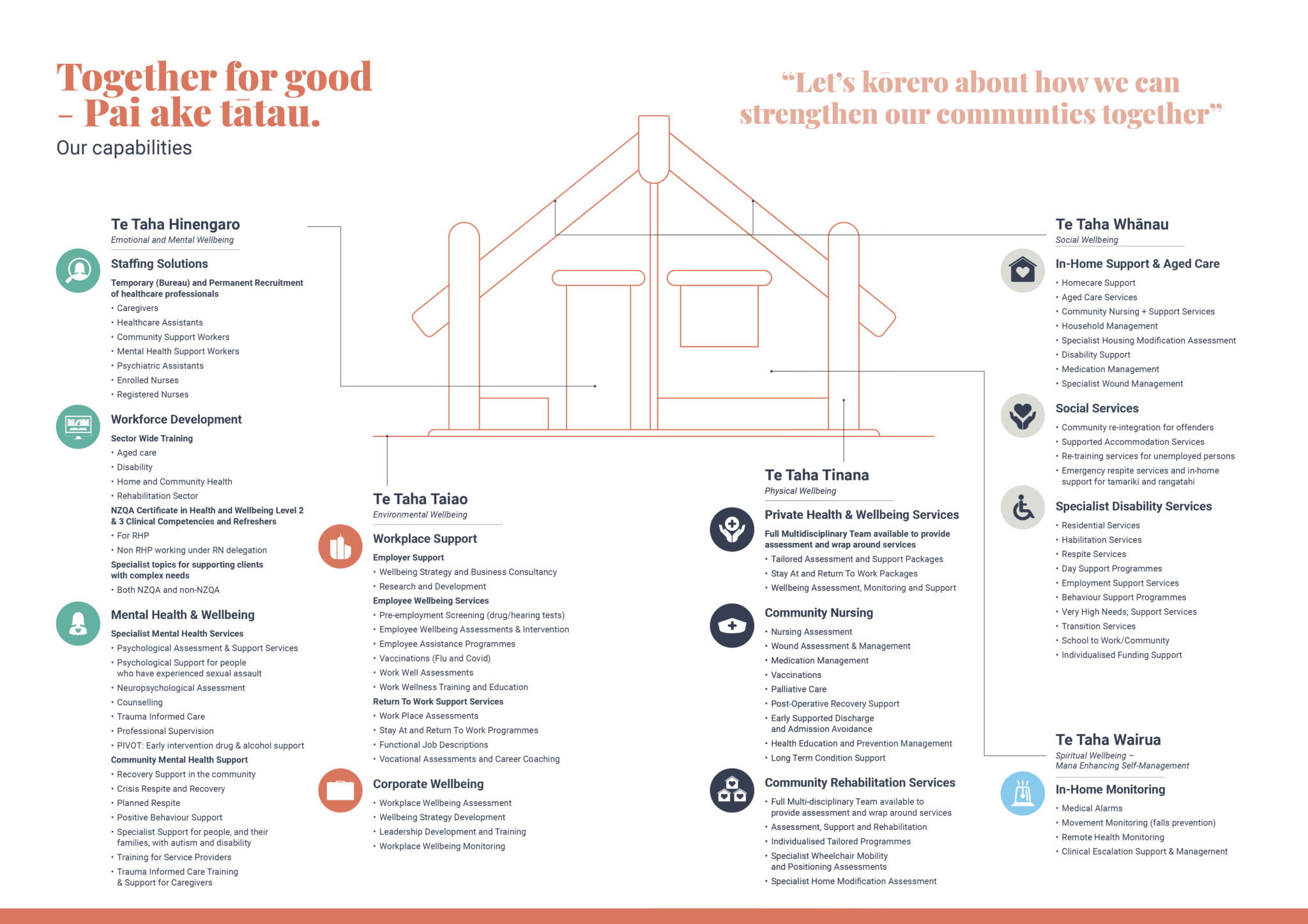 We see our capabilities in the context of Sir Mason Durie’s Te Whare Tapa Whā model, a Māori health model which promotes balanced, holistic wellbeing and encompasses 4 dimensions: Te Taha Hinengaro (Emotional and Mental Wellbeing), Te Taha Tinana (Physical Wellbeing), Te Taha Whānau (Social Wellbeing), and Te Taha Wairua (Spiritual Wellbeing). We have also included a fifth element – Te Taiao (Environmental Wellbeing).