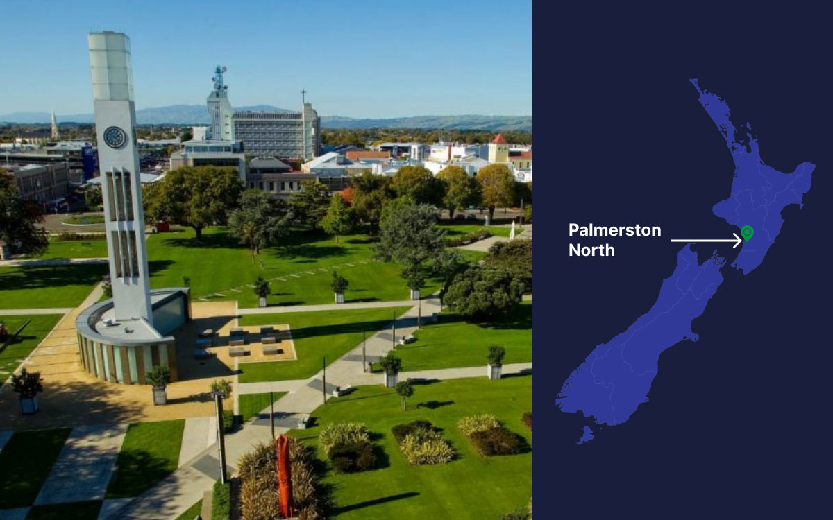 Palmerston North is located in the Manawatū-Whanganui region of the lower North Island of New Zealand. Nestled in the Manawatu plains, Palmerston North’s central location makes it a strategic hub for access to both the west and east coasts, as well as being a convenient stop for travel between Wellington and Auckland.